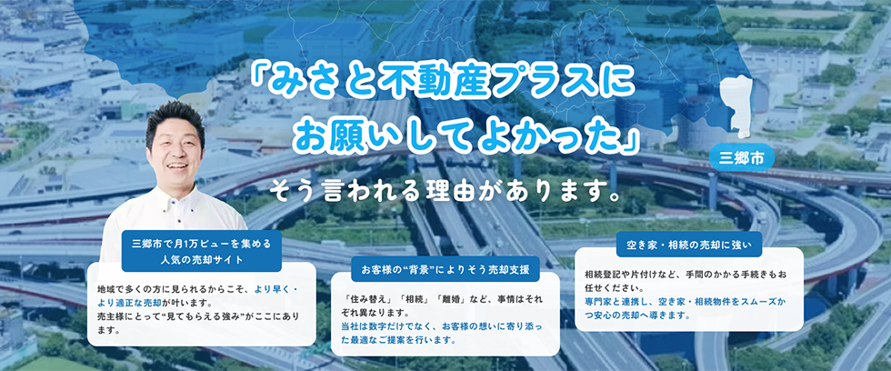 三郷市を拠点に地域密着で不動産売却・空き家買取を手がけるみさと不動産プラス株式会社は、JR武蔵野線「三郷」駅より徒歩1分という好立地から、三郷市・越谷市・吉川市を中心に埼玉県・東京都・神奈川県・千葉県の広域に対応しています。